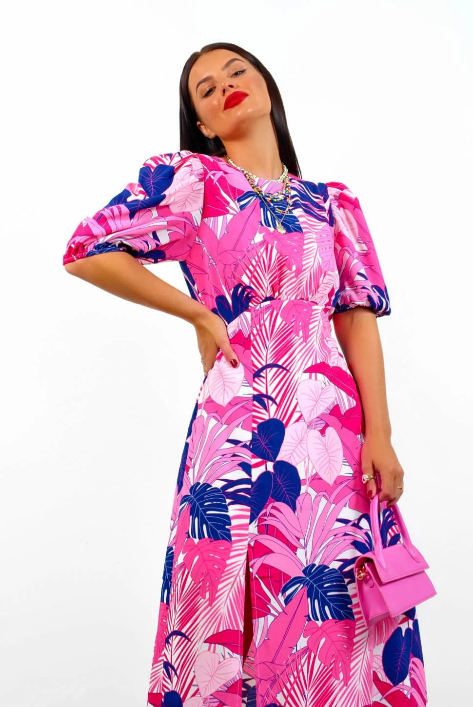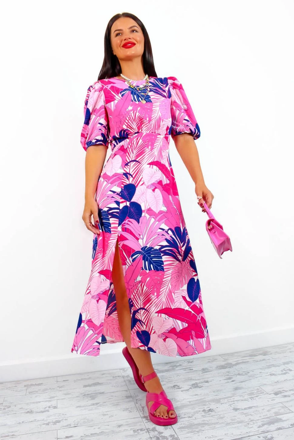 You have a reason to be vain doll. Featuring elasticated puff-sleeves, a rounded neckline, an empire waistline, and a pink blue tropical print, this number is a definite holiday go to. Imagine you’re walking along the beach after dinner watching the sunset in this dress…perfect. Just style with navy accessories and you’re holiday fit is complete.