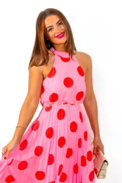 Spot The Difference – Pink Red Polka Dot Halter Neck Pleated Midi Dress