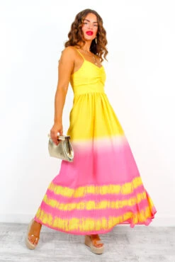 Wanderin Free – Lilac Yellow Abstract One Shoulder Midi Dress