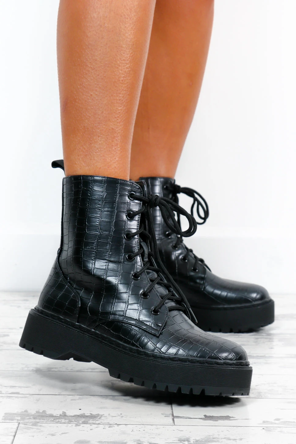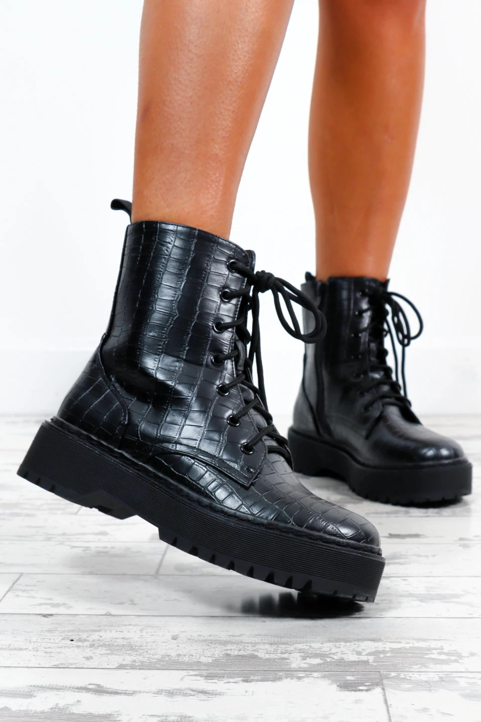 Time to get suited and booted, Doll! Steal the show and stomp the streets in these boss ass black croc ankle boots. Complete with chunky sole, lace-up front and side zip in an edgy mock-croc boot texture. A bang-on-trend twist on a winter wardrobe classic, these chunky black boots are the perfect companion for whatever outdoor shenanigans you get up to this season!