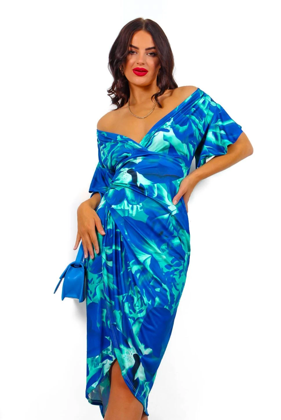 She’s badder in blue. Figure hugging to create a stunning silhouette, this bodycon midi is finished with an abstract blue and green print throughout. With dreamy flowy angel sleeves, a plunging neckline and a flattering drape detail that creates a sassy leg split, it’s the epitome of elegance! Strut to the bar in contrasting fuchsia accessories and prepare to have all eyes on you.