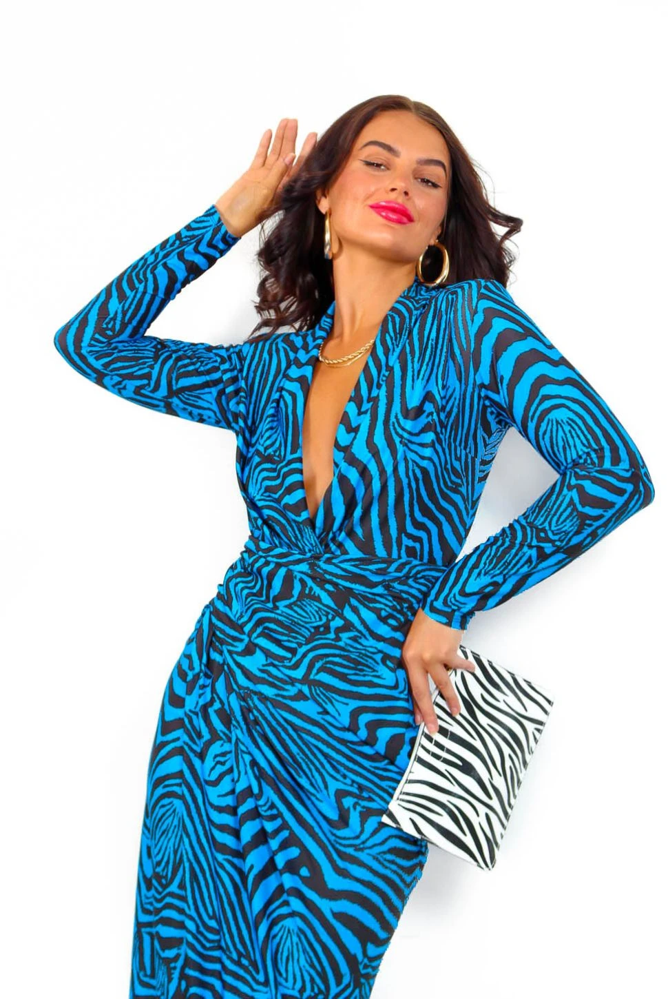 Two words to describe you, Doll: simple and elegant! This sleek midi features a blue zebra print throughout, long sleeves, a plunging neckline, and a draped front leading into a flattering front slit. It may feature stripes but you’re sure to be spotted in this number! If you’re feeling bold, pair with an orange clutch and matching heels.