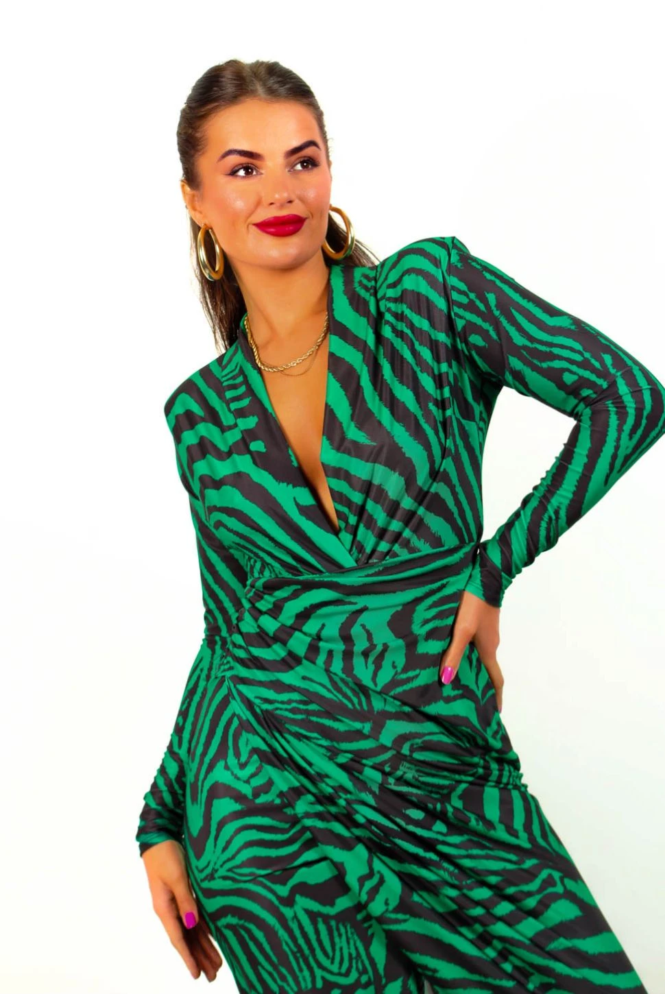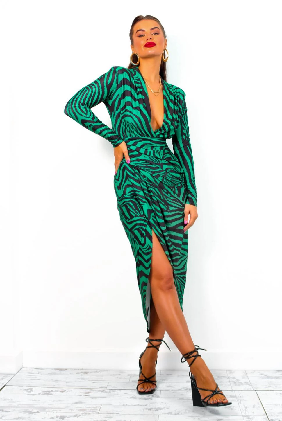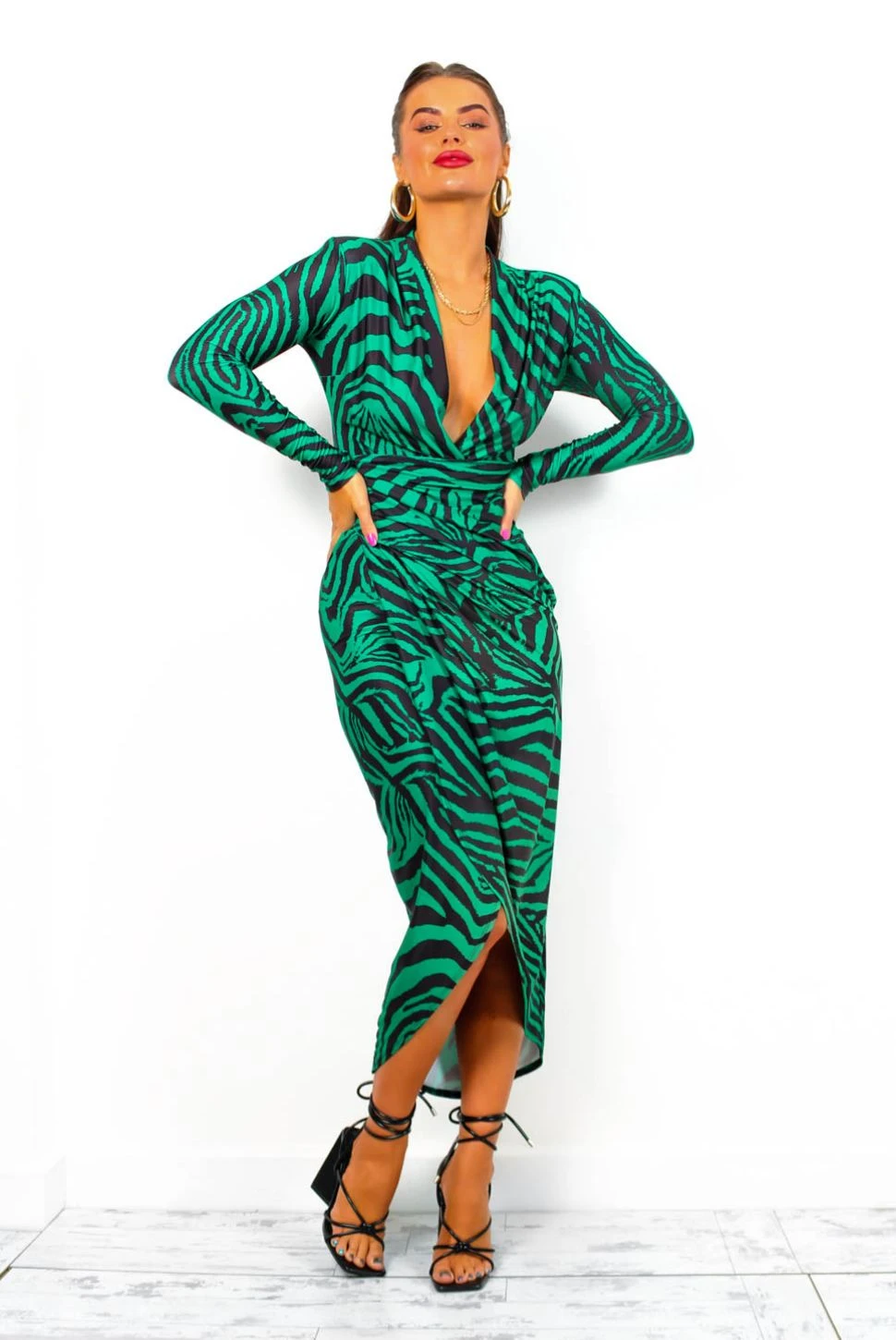 This dress may be striped but you’ll certainly be spotted in this number! In an emerald green zebra print this elegant favourite features a flattering slinky fabric, long sleeves, a plunge neckline and a draped front to show off some leg. Style with glowing gold accessories for a look that will have everyone going wild.