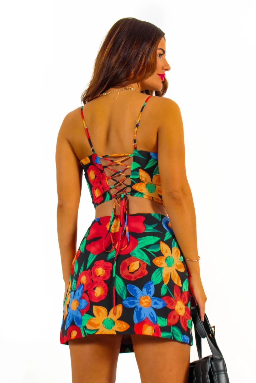 We like it hot, Doll, but you’re too hot to handle! Now the sun’s back and beach days are on the horizon, turn up the heat in your wardrobe with this spicy senorita-worthy top and skirt co-ord. Featuring a matching mini skirt and lace-up top blooming with tropical florals in bright green, blue and red hues – we’re making room in our suitcase for this number as we type! Just slip on with chunky platform sandals and sleek black shades for scorching lazy Sun-day style.