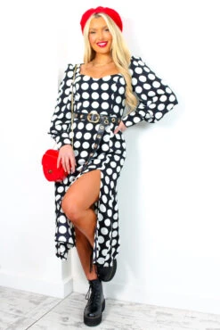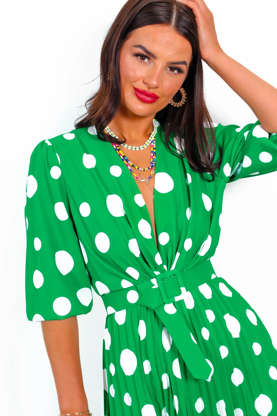 You’ll never spot me in the corner, I’ll always be on the dancefloor! This gorg green polka dot midi dress comes in this years must-have colour with a polka dot design, a matching belt to cinch and a perfectly pleated swishy skirt. White mules are a must for a look that stuns at the daytime, but is still on point for the night time do.