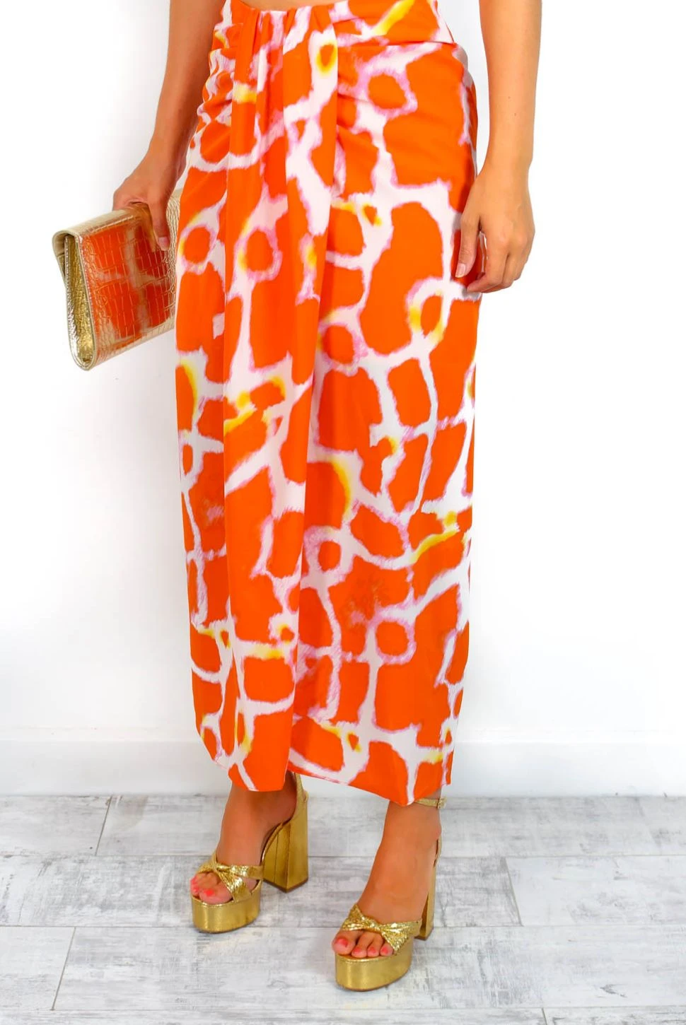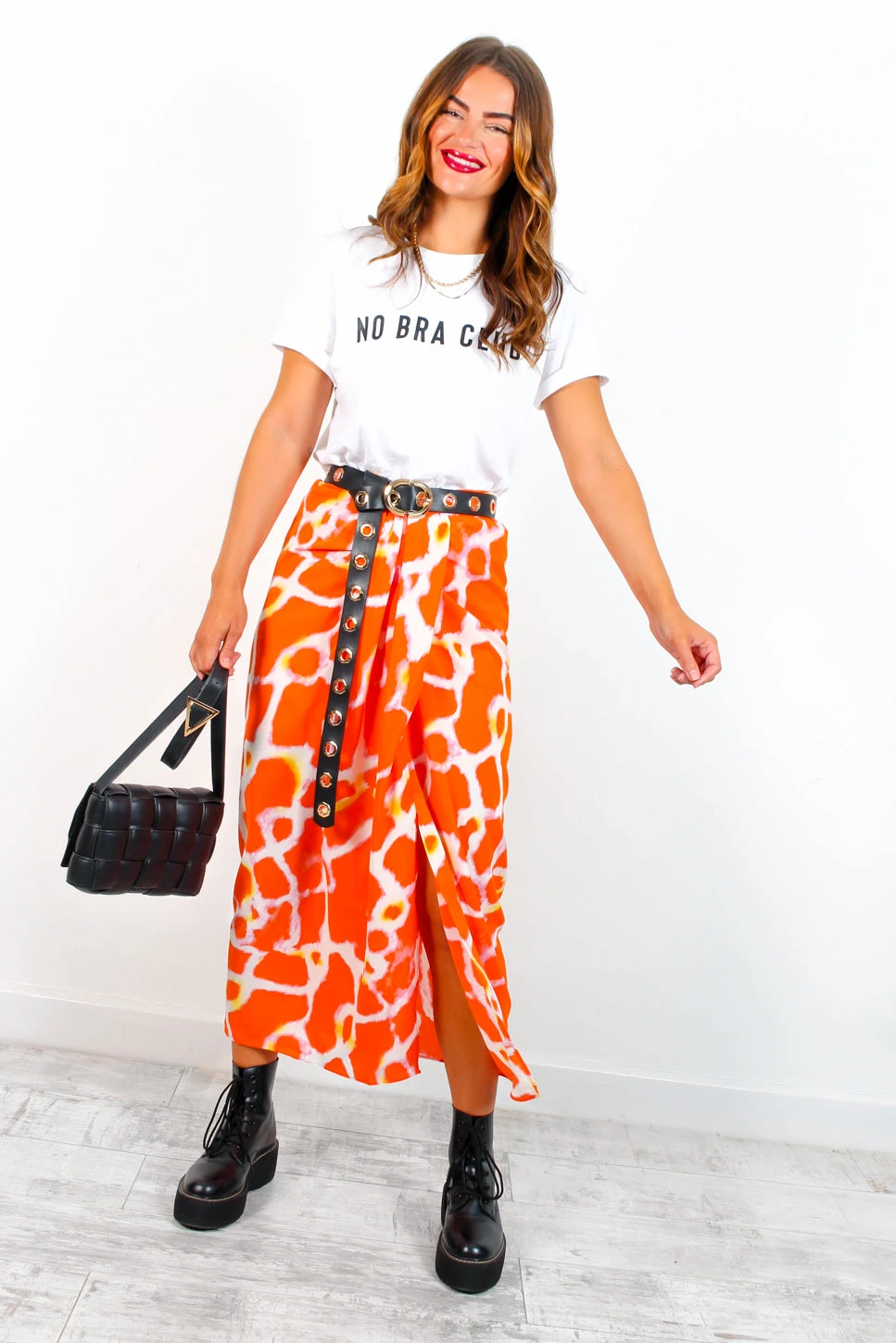 She can’t be tamed! Put your wild side on full display in this fierce orange animal print skirt. In all-over orange and white giraffe print, this orange split skirt features a fierce front leg split with chic gathered detail in the front for the pawfect touch of chic style. Keep it tame with a denim jacket and strappy sandals, or show ’em the real queen of the jungle in a bold white bodysuit and all-gold accessories. Zip up and strut out – it’s time to turn heads!