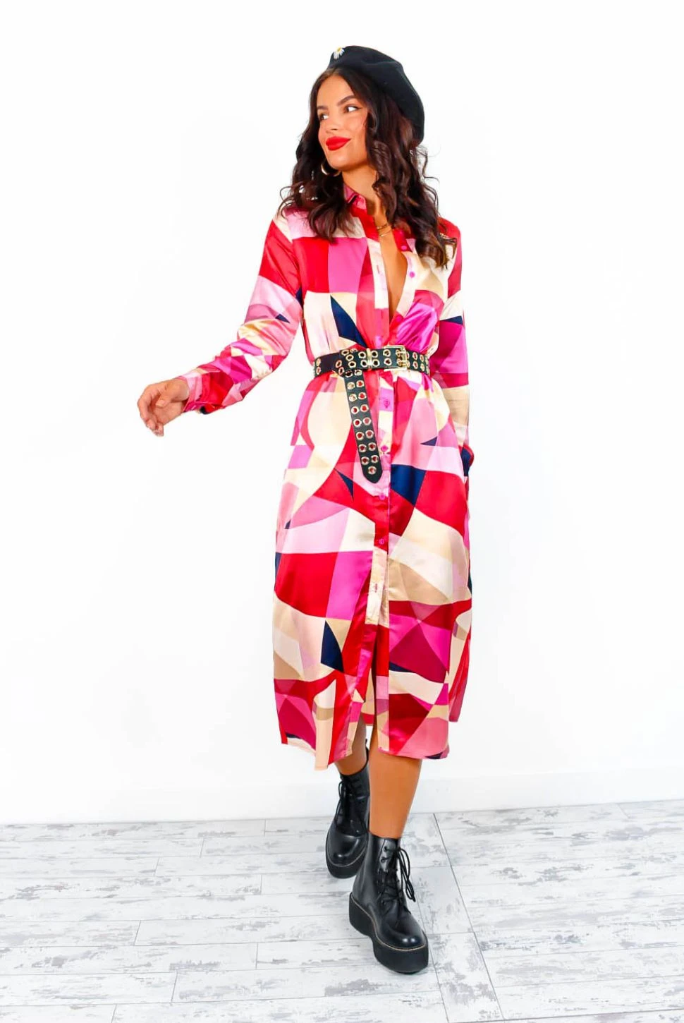 Girl, you look sensational! In a midi length, this chic shirt dress comes in shades of pink abstract print throughout, long cuffed sleeves, button-down fastening, and a matching removable fabric belt to accentuate that waistline. Strut your stuff in matching pink heels and clutch bag.