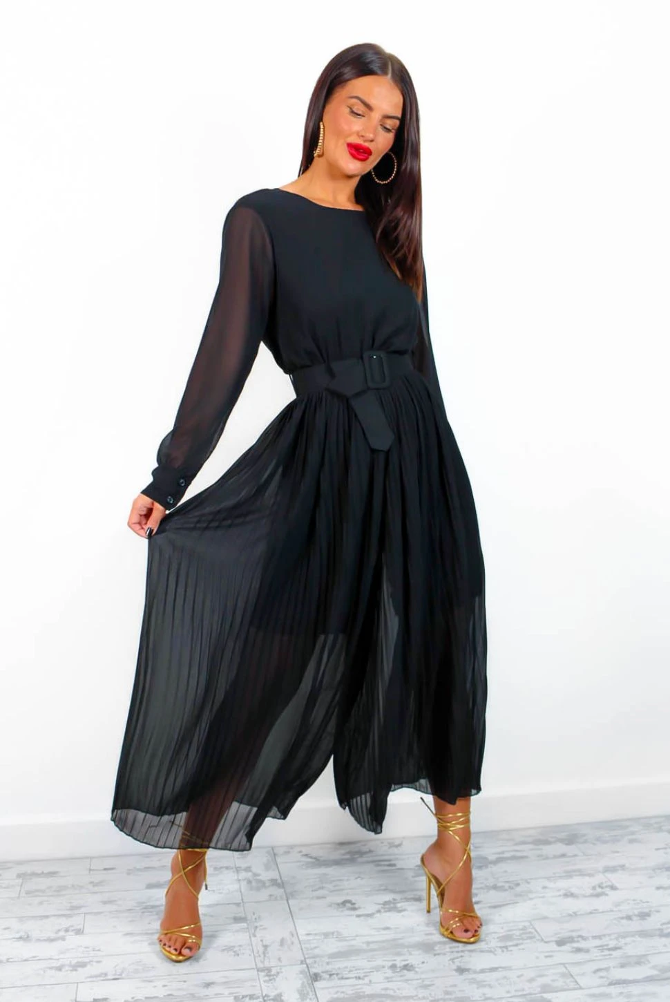 Transform your new season wardrobe with this chic classic jumpsuit. Featuring a plunging neckline, long sleeves and pleated fabric the wide-leg fit makes this jumpsuit super comfy and wearable whilst the belt cinches in the waist for a flattering silhouette. Pair with a statement colour heel to up your style game.