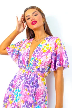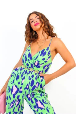 Prepare to pleat your perfect match! This gorgeous green leopard print jumpsuit features our favourite forest green colour peppered with pops of punchy fuchsia leopard print throughout. Finished with a pleated wide leg fit and removable waist-cinching belt, it’s the perfect all-in-one piece for any amazing event or prosecco-filled party. For styling we’re thinking pink, so sling on a strappy heel and shoulder bag combo in your fiercest fuchsia hue to make ’em all wink!