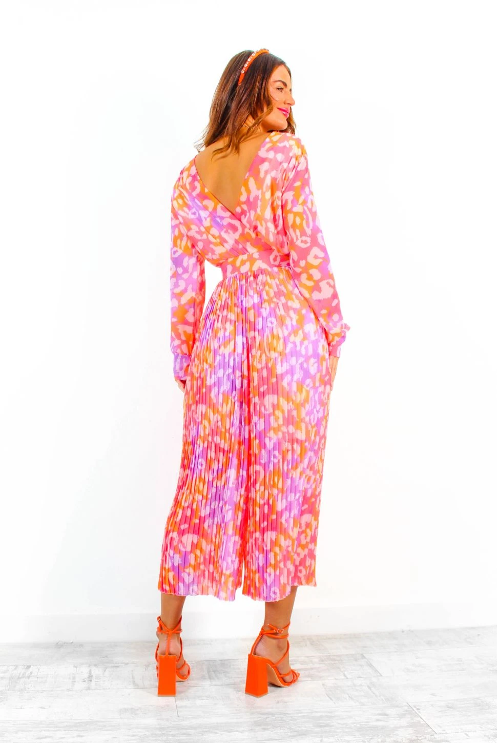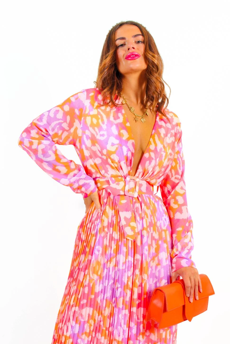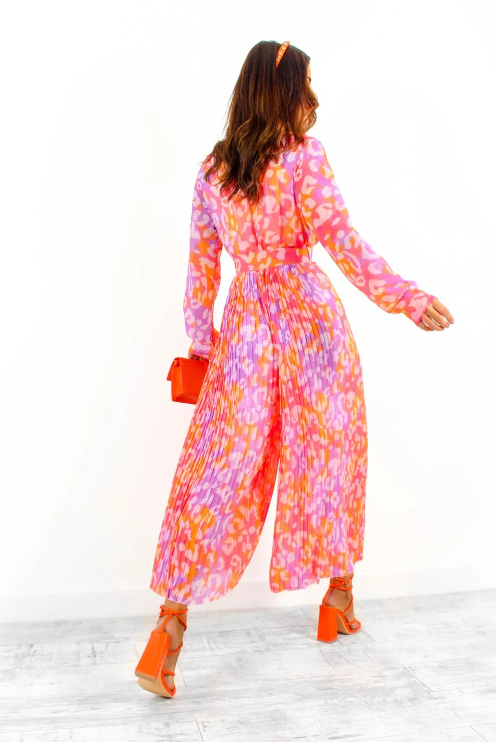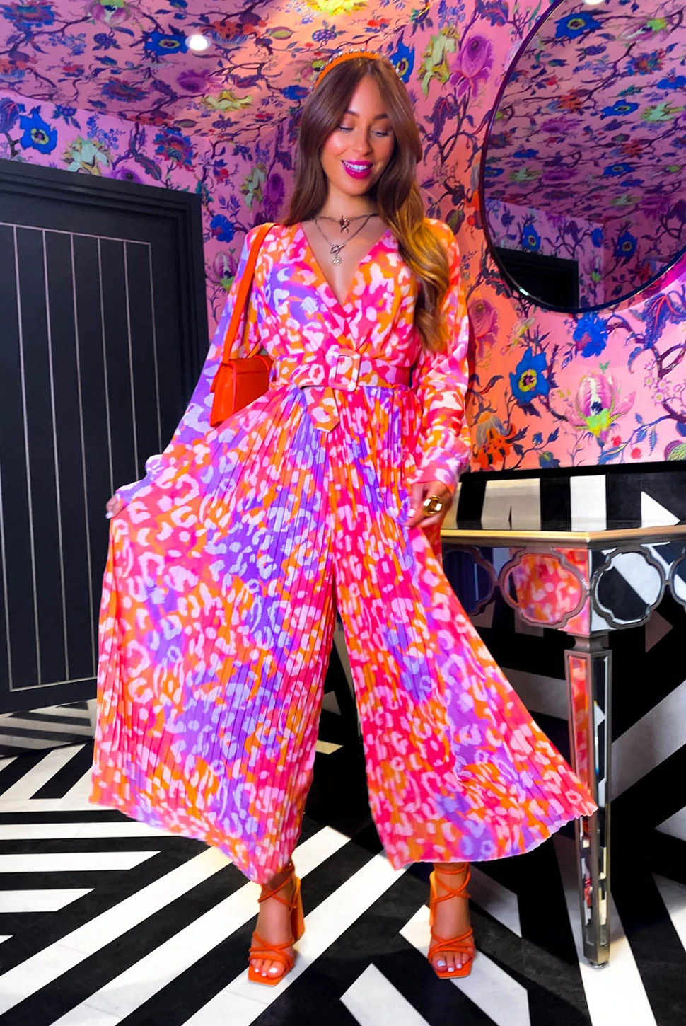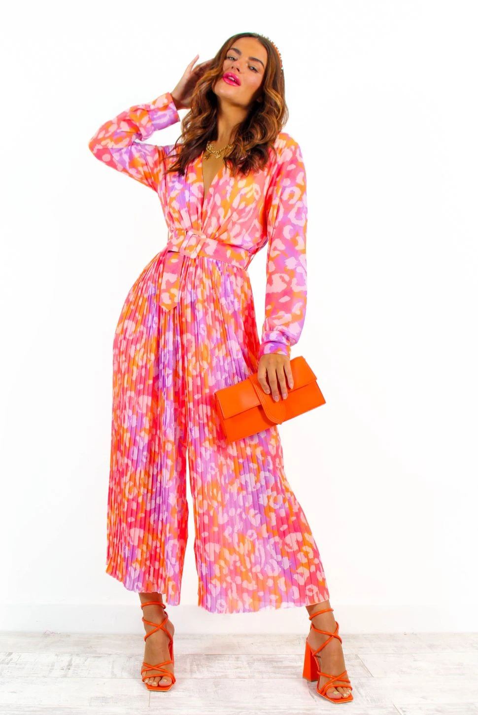 It’s wedding season, Doll, and this feisty fuchsia and orange animal printed jumpsuit pairs perfectly with a glass of champers! Featuring a plunging neckline, long sleeves and pleated fabric, it’s no wonder this style is one of our bestsellers. The flowy wide-leg makes for a super comfy and wearable fit whilst the matching belt cinches your waist creating a flattering silhouette. Style with matching orange accessories for those save the date occasions.Â