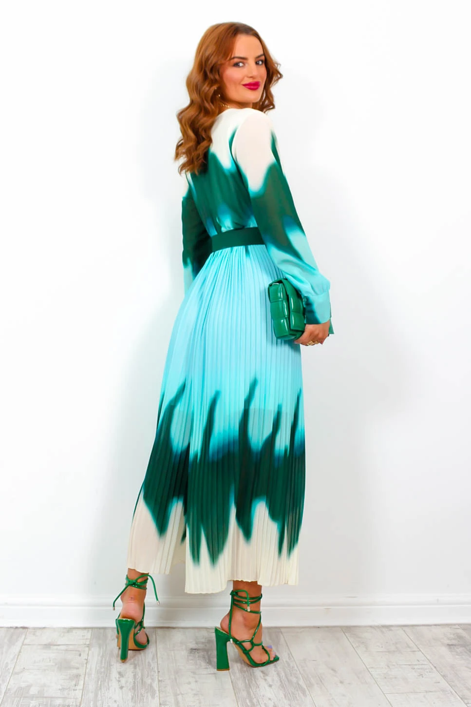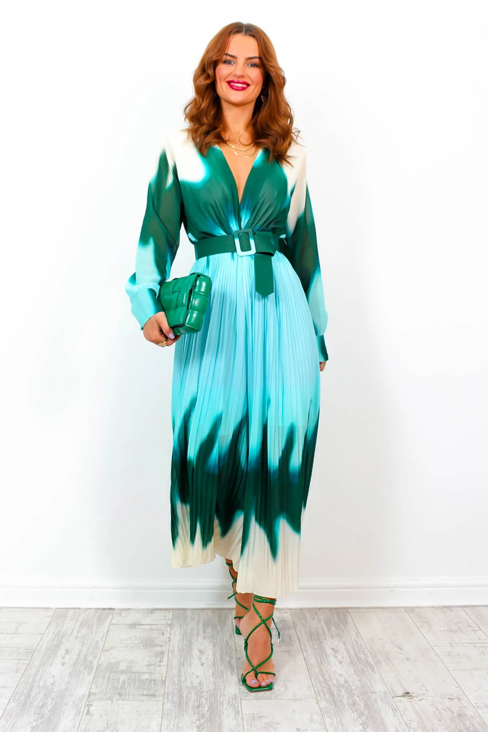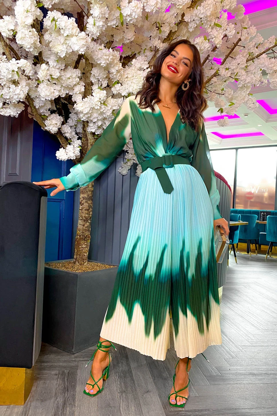 Pretty in pleats! Featuring a plunging neckline, this classic jumpsuit has long cuffed sleeves, wide-leg pleated trousers, and a cream, forest green and turquoise ombre design. Wear it round neck style with gold jewellery and a green clutch for best dressed at that wedding you’ve got coming up, pass us the prosecco!