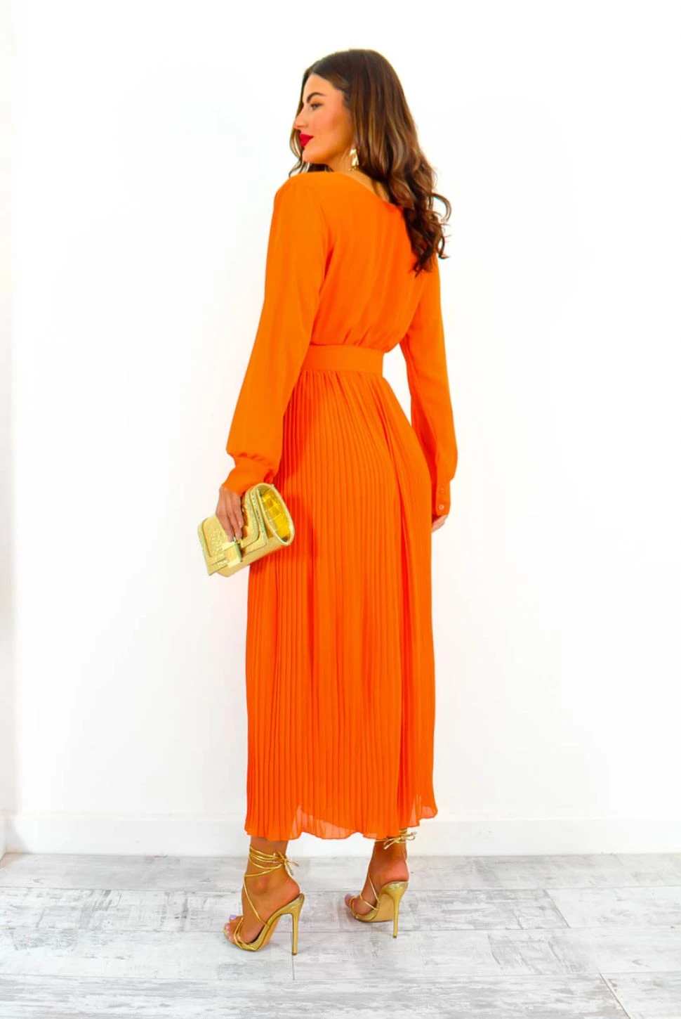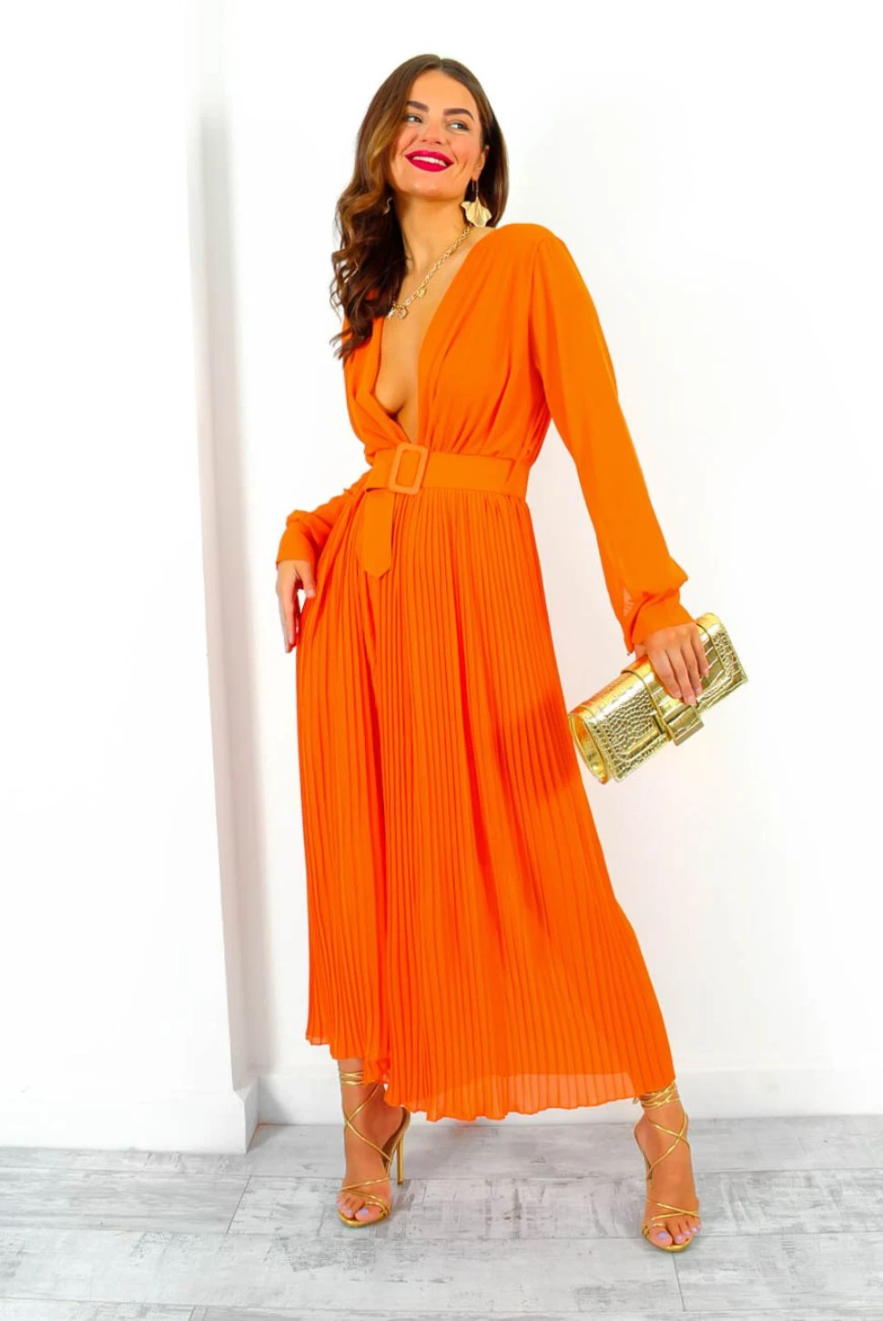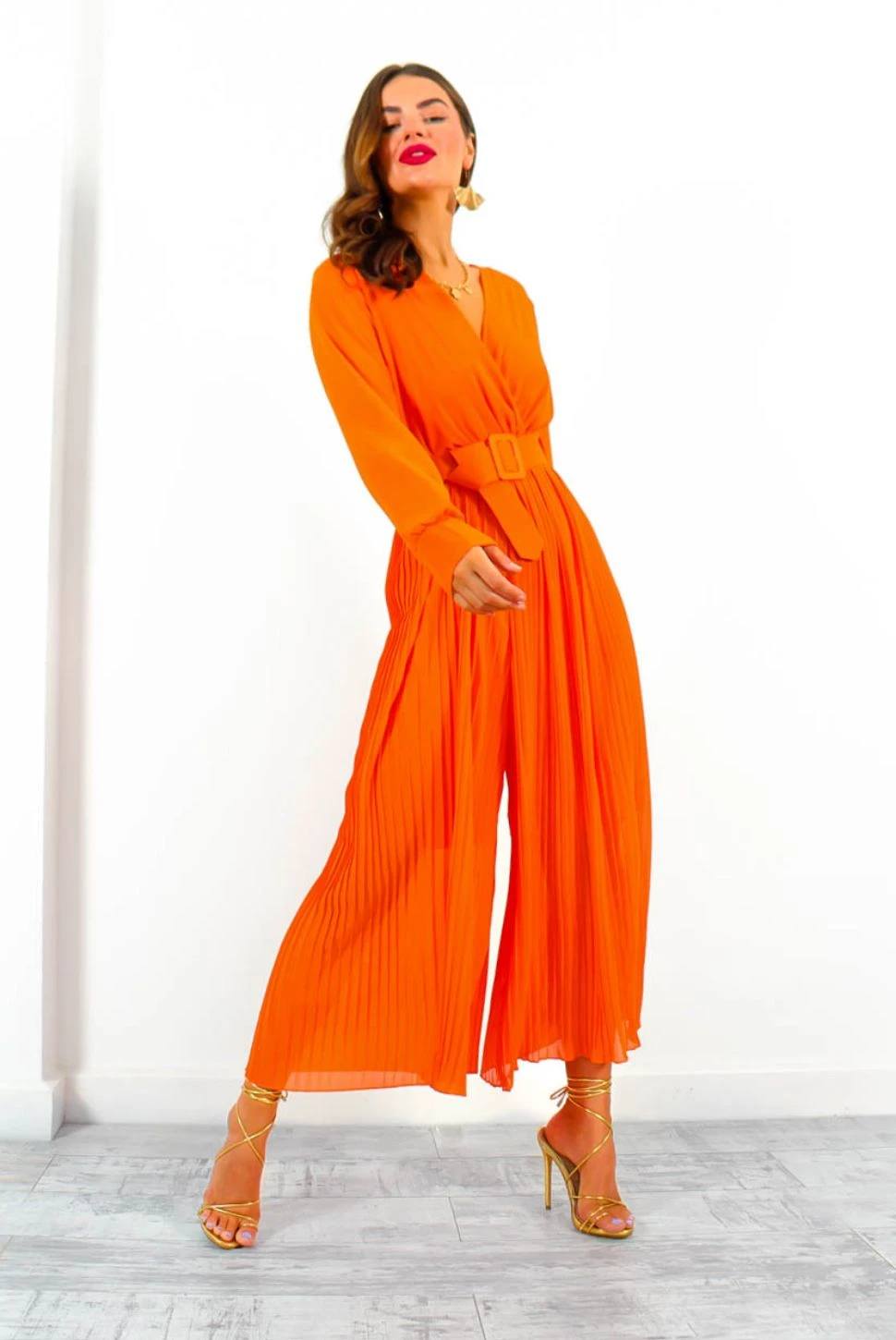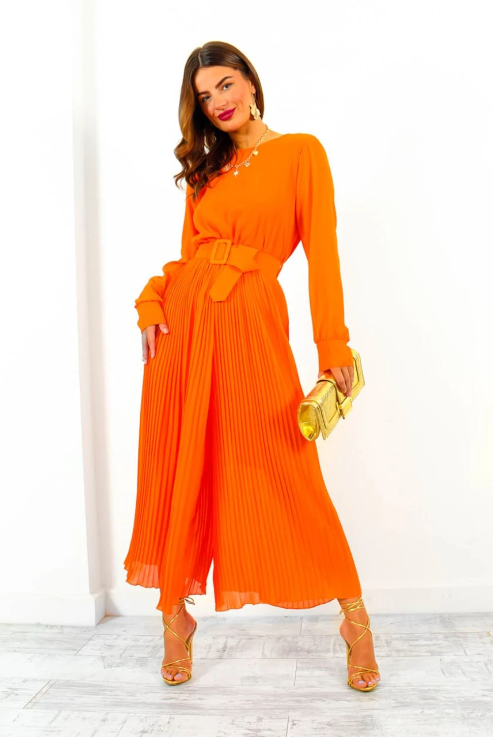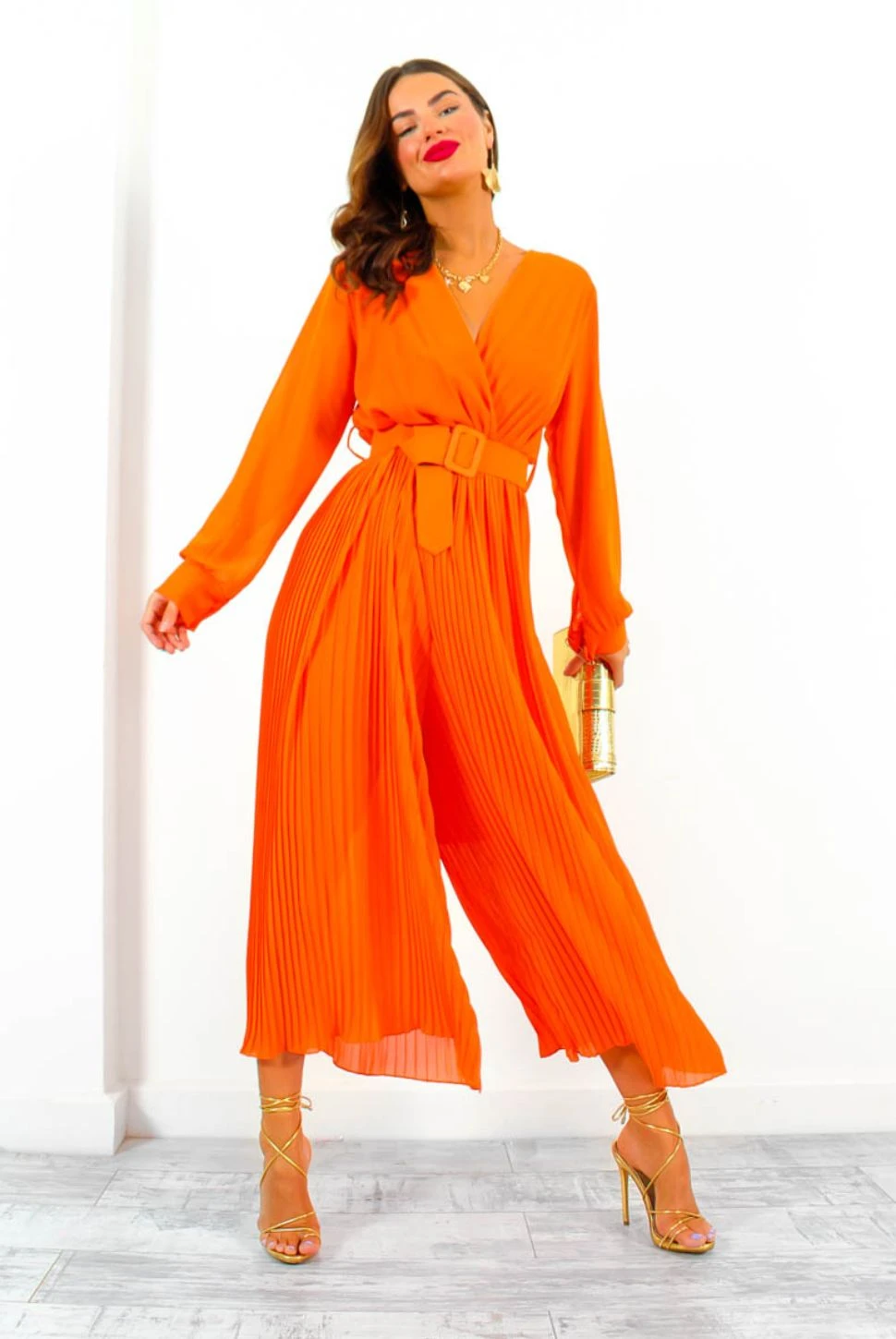 Category is: zesty! Orange is the new black, Doll, and we’re obsessed with this juicy orange pleated jumpsuit. Featuring a plunging neckline, long sleeves and pleated fabric, no wonder it’s a fan favourite. The wide-leg fit makes this jumpsuit super comfy and wearable while the matching belt cinches your waist for a flattering silhouette. Style with matching orange accessories for a day at the races!