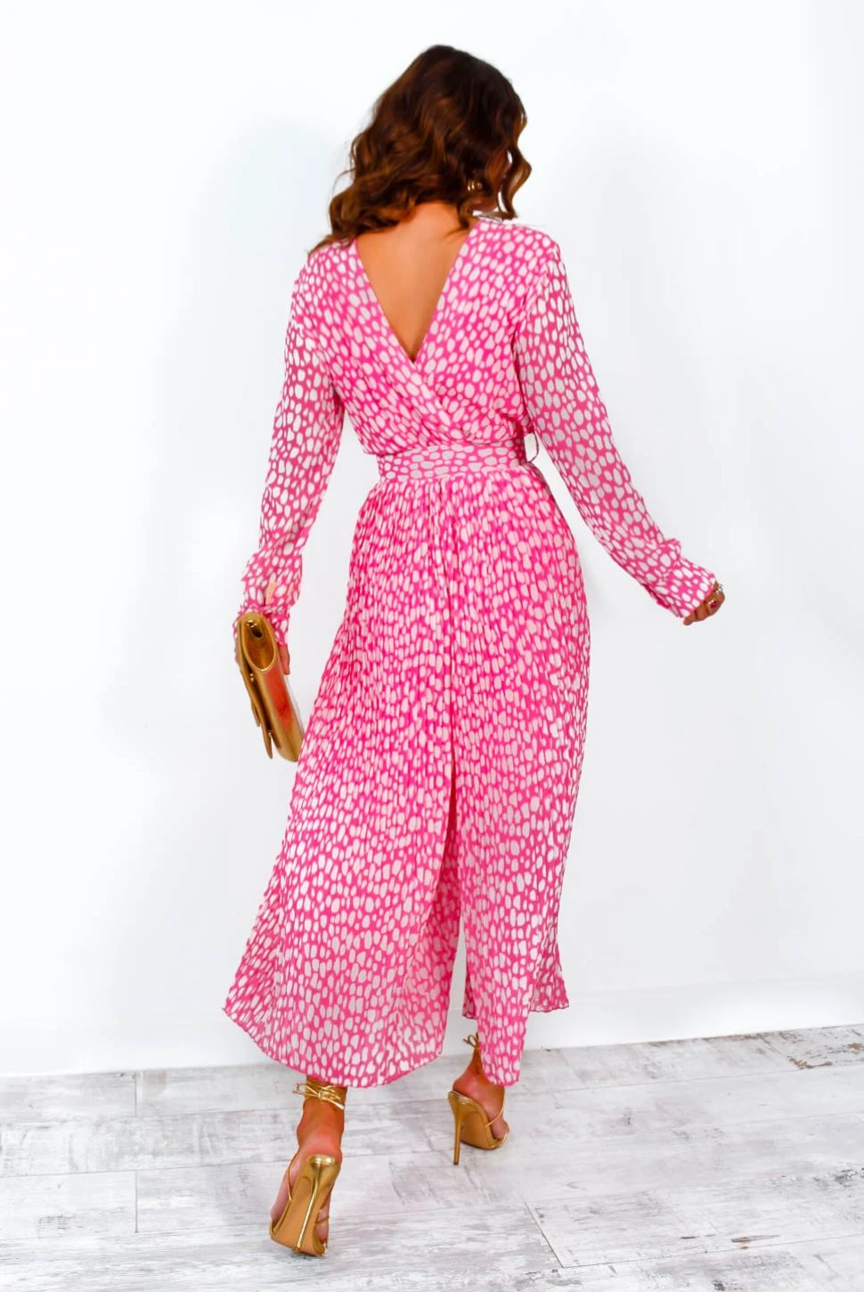 Animal print never looked so good, Doll, and this pink jumpsuit is at the top of our must-have list. Featuring a plunging neckline, long sleeves and pleated fabric, it’s no wonder this style is one of our bestsellers. The flowy wide-leg makes for a super comfy and wearable fit whilst the matching belt cinches your waist creating a flattering silhouette. Style with contrasting orange accessories for those save the date occasions.Â