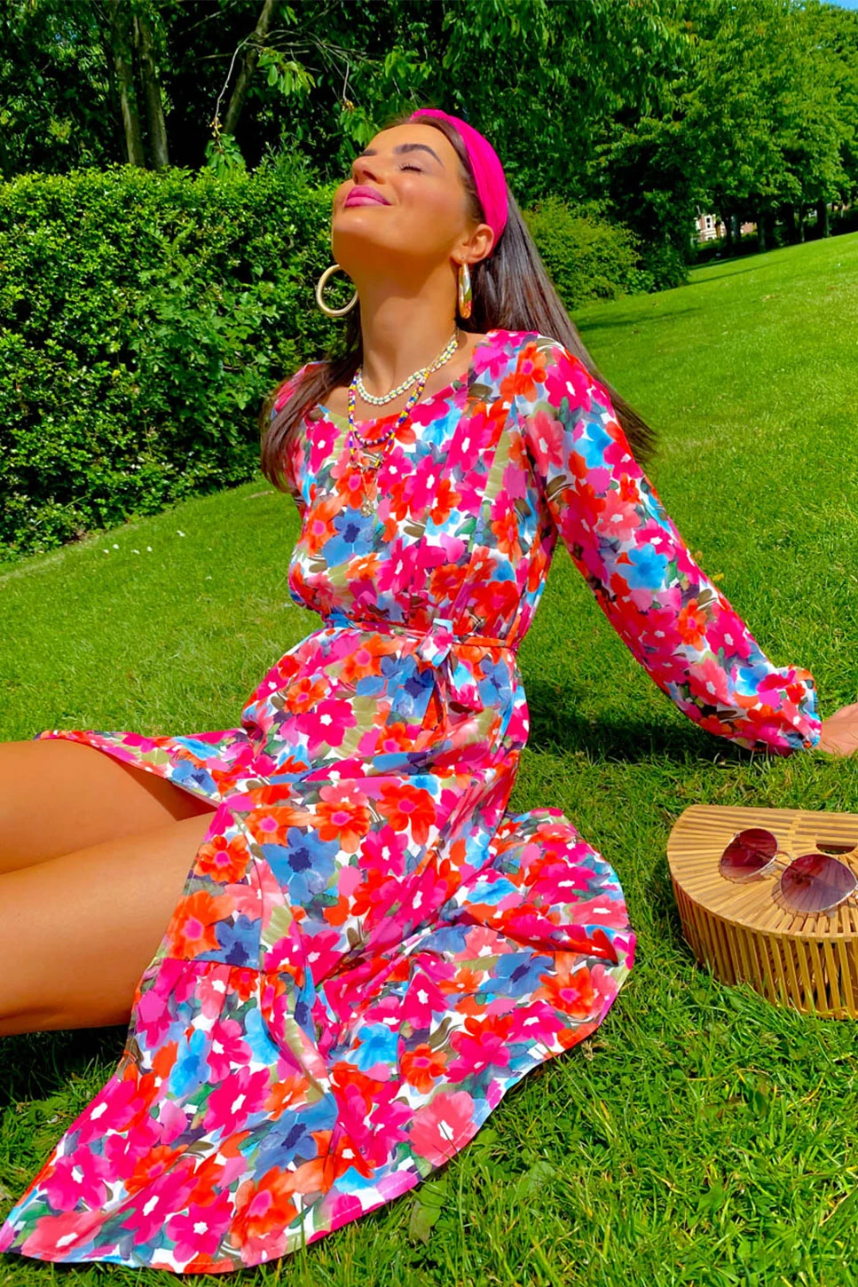 Thinking of spring, or what you want to wear for spring? Either way we got you covered. This beautiful midi dress features a white base fabric with a pink, orange, blue, and green floral design. Also including a structured square neckline leading into long elasticated cuff sleeves, a matching material belt, an elasticated waist, and a floaty hemline. White mules are a total yes for this dress, finish with a cute white mini shoulder bag and you have the ultimate spring look.