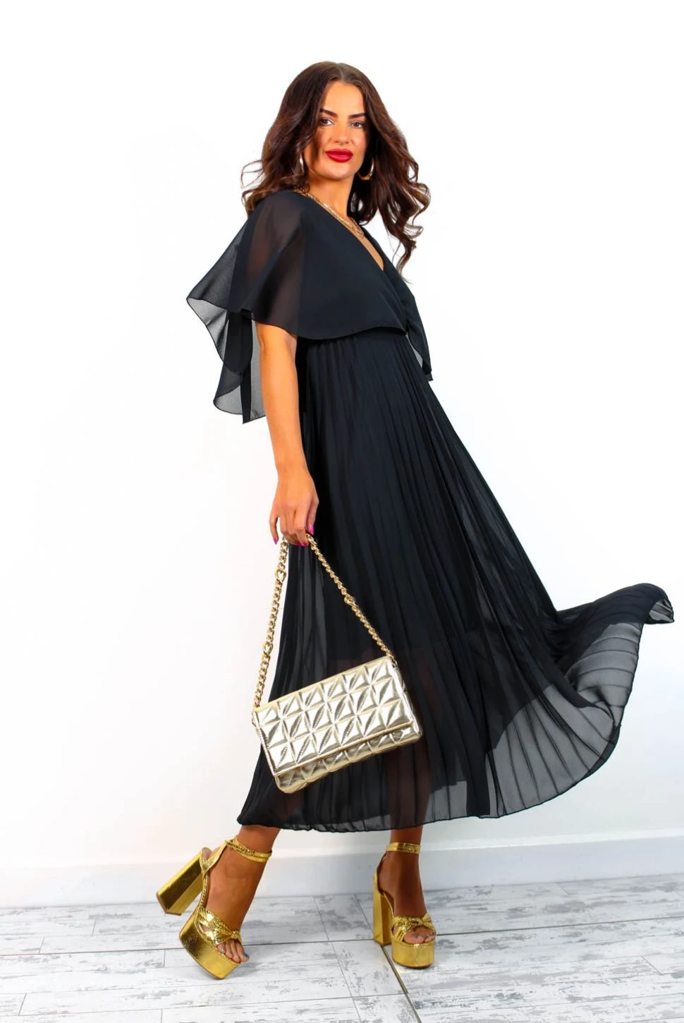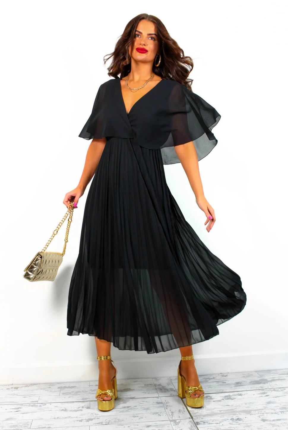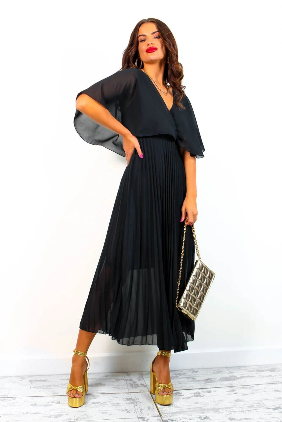 Everyone needs a black dress in their life, and of course we’ve got you covered with one of our top picks in a beautifully elegant style. Featuring flowing batwing sleeves with a cut-out back and pleated skirt, this silhouette still offers comfort whilst being totally flattering. Go monochrome with your accessories and add a red lip for a pop of colour.