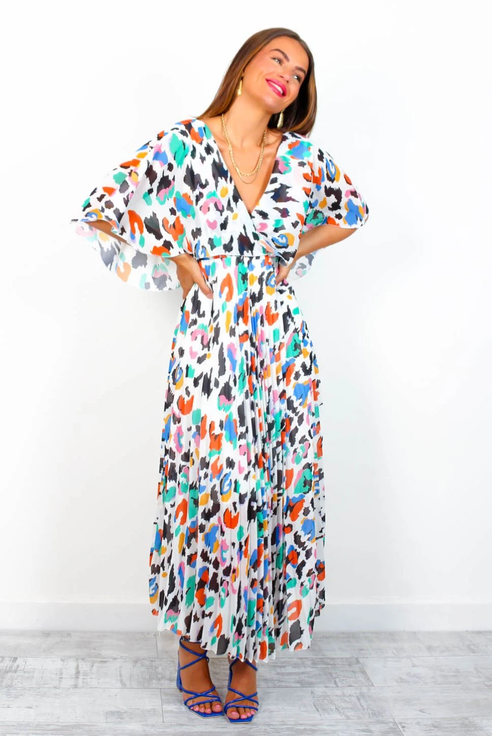 In a world of trends, be timeless, Doll! With a statement cut-out back and floaty angel wing sleeves, this Doll-favourite backless midi-maxi dress rocks showstopping pleats in all-over multicolour leopard print for a wild and whimsical twist. Rise to the top of the best dressed list at sunny summer weddings and bff brunches, paired with colour pop heels and a bold red lip.