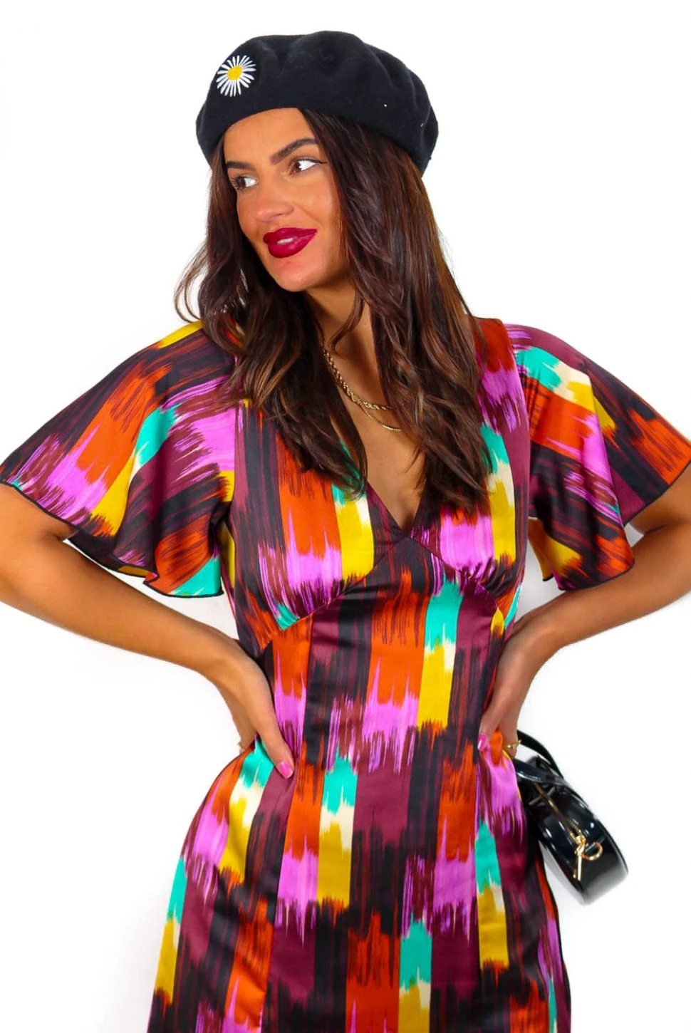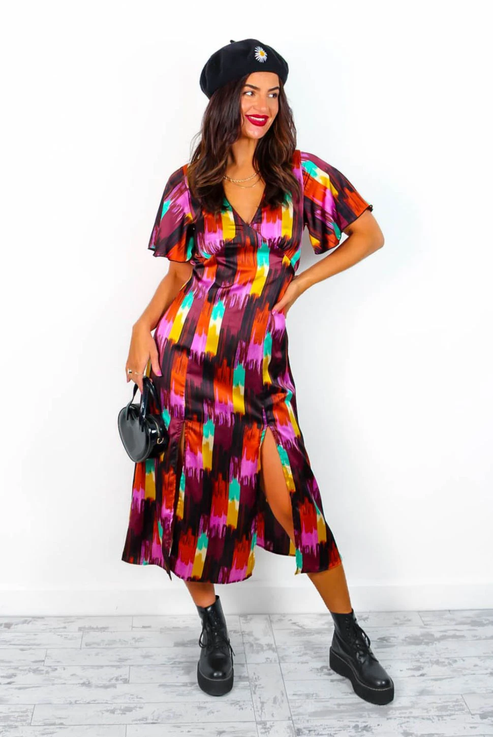 We have a forever type of love for this dress! We’re totally loving this print and colours… a brushstroke style abstract print in black, burnt orange, burgundy, yellow, pink and green. In a midi length, this dress features short floaty sleeves and a double leg split for a flirty and fabulous flair. Pair with a romantic red lip because you know you just can’t help falling in love.