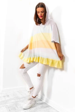 Add a chilled-out twist to your Summer wardrobe with this casual striped hoodie. With shades of lilac, yellow, and orange, this hooded top radiates mellow summer vibes. Throw over a cami and pair with shorts and flip-flops for a laid-back look.