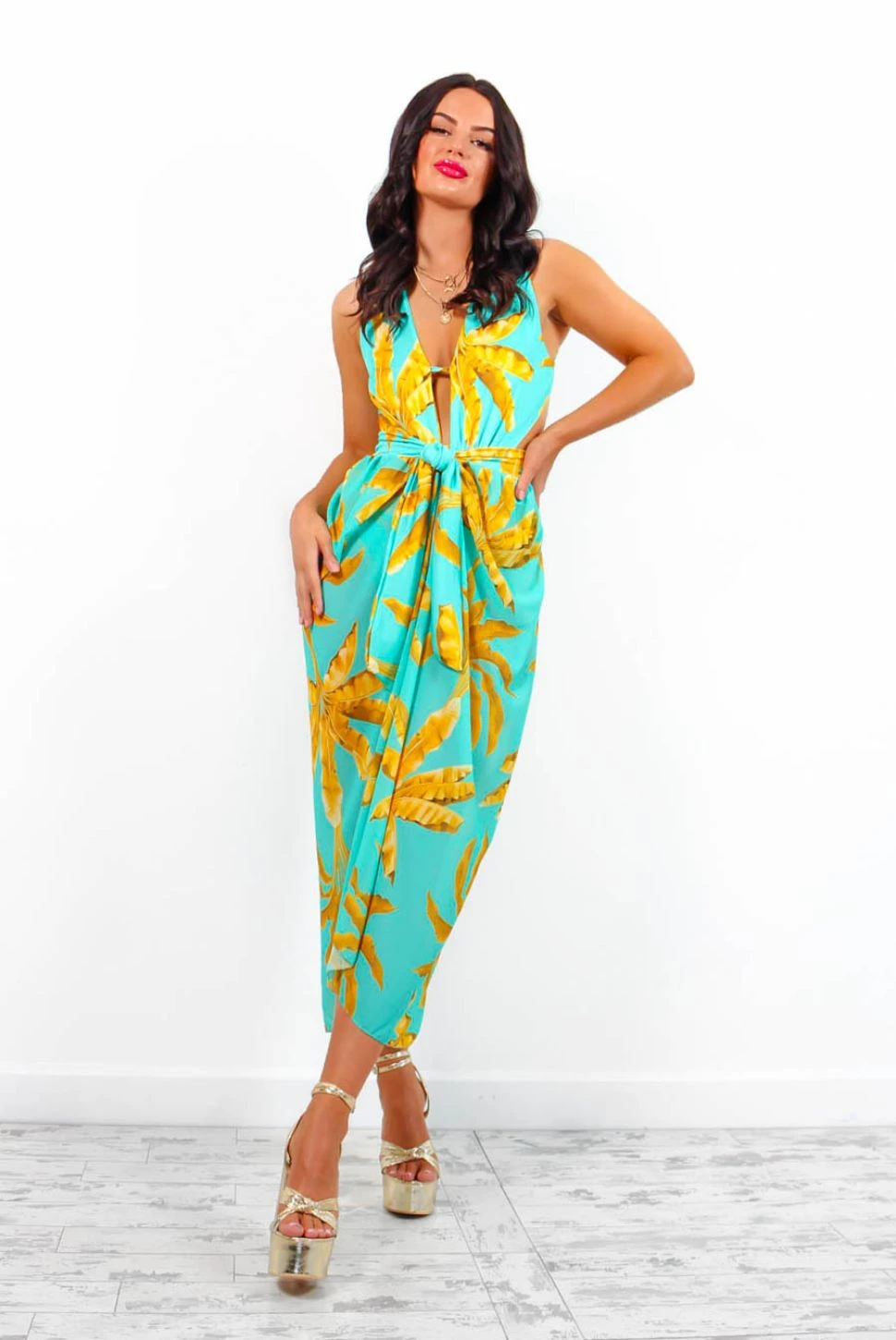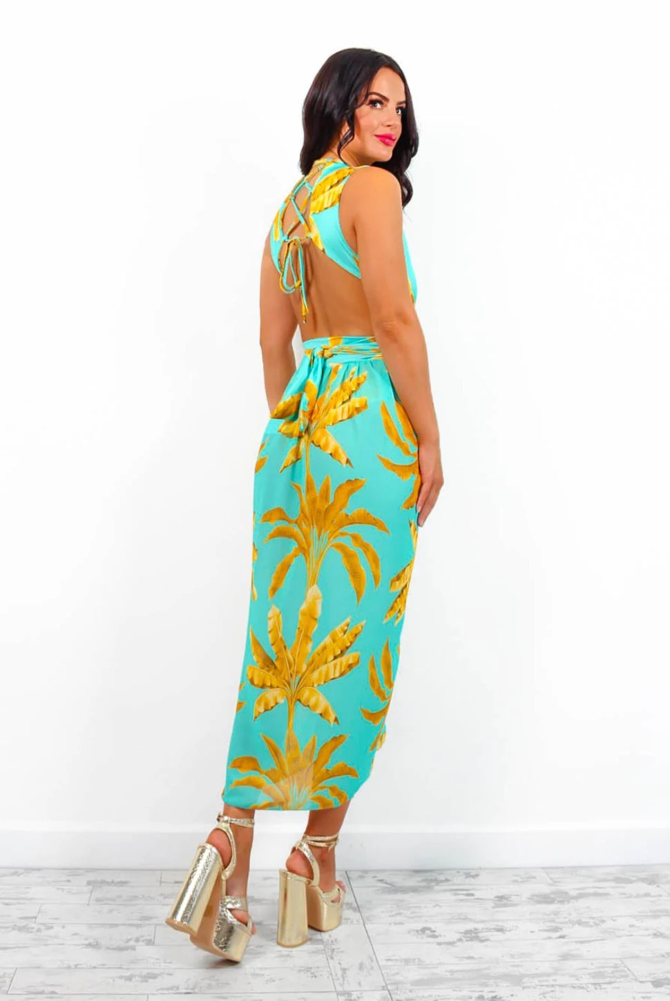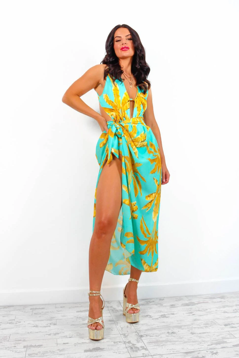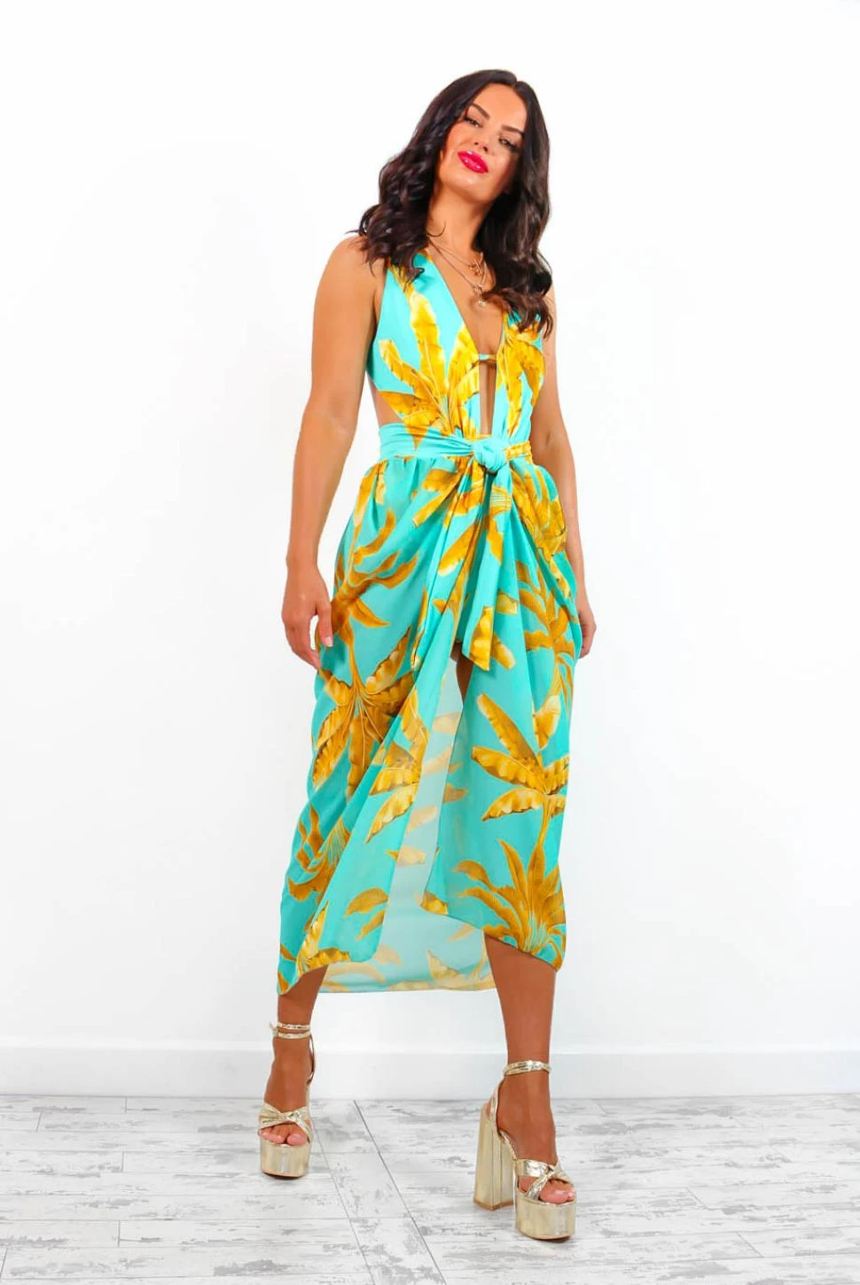 Oh to feel that sea breeze on your face…This flattering co-ord features a plunging neckline swimsuit with cut-out side detailing, criss-cross back detailing with adjustable straps, and a back cut-out. The matching wrap cover up features a swimsuit material waistband and identical tropical print, be the best dressed on your long awaited gals holiday or have your partner drooling on that romantic getaway.