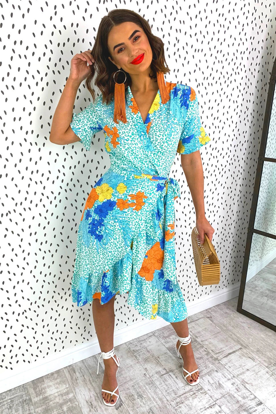 You don’t need to be off to the tropics to look good doll. This midi dress features a turquoise floral print with pops of orange, yellow and cobalt throughout, short sleeves, a tie waist with wrap fastening and a frilled hem. Pair with orange heels for a bright and stylish look that’ll get you noticed.Â