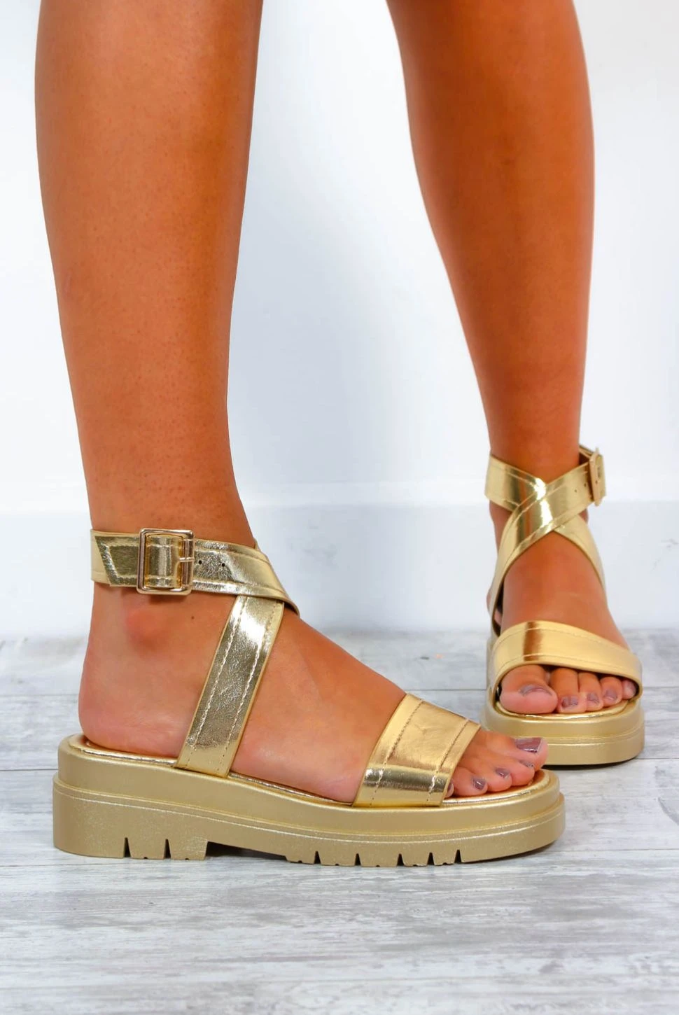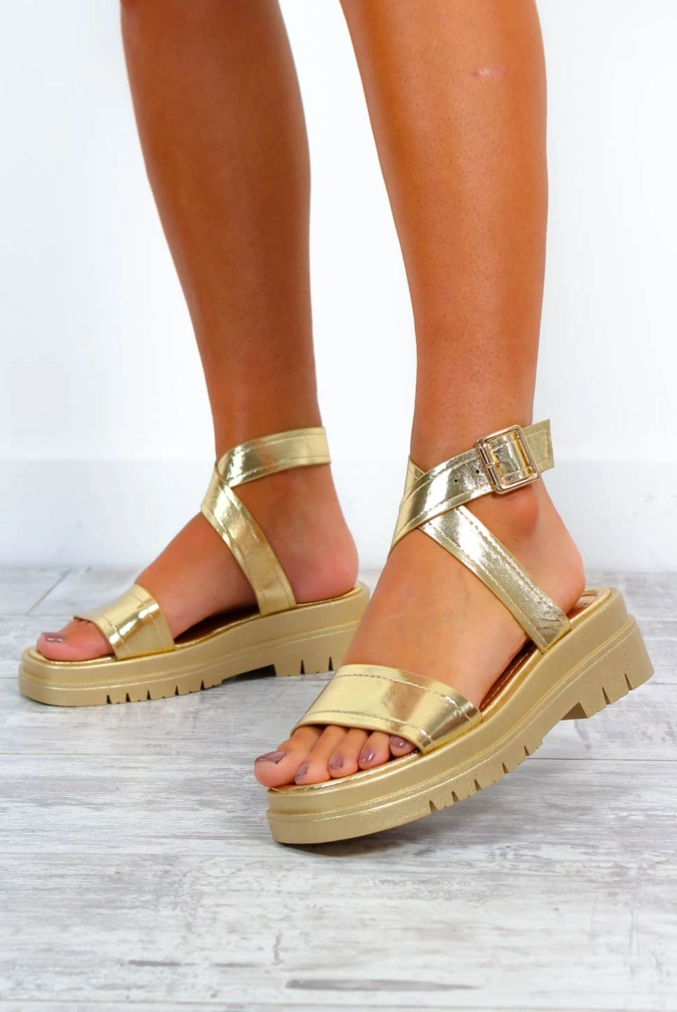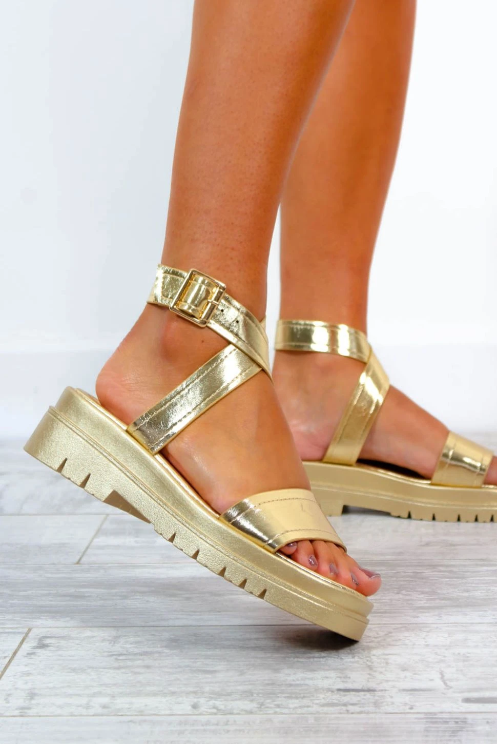 Try and handle me! Elevate your summer style in these statement strappy sandals. These stunners feature a radiant gold colour, a chunky cleated platform, and a chic cross-over ankle strap with a buckle fastening. Get ready to glow and step into the spotlight at those Summer drinks in the beer garden.Â