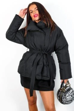 I solemnly swear that I am Up to Snow Good! This short black puffer jacket is an absolute must for colder days. It comes in a trending short length with a chunky collared neck, side pockets, cuffed sleeves and matching black tie waist to cinch the silhouette. Pop on over a slouchy jumper with faux leather leggings and chunky boots to boss the season in toasty style.