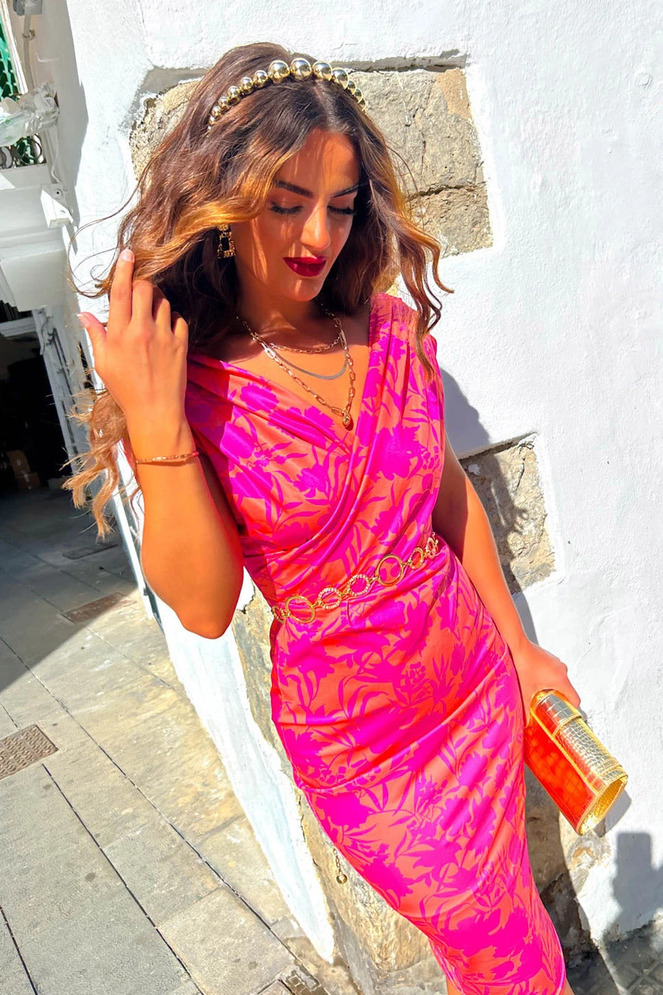 Seriously, what’s not to love about this blooming beautiful floral midi dress? Midi length with a sleek and sassy bodycon fit that flatters your curves in all the right places, it’s finished with a chic ruched shoulder detail and cross-over drape neckline that’ll turn heads at any upcoming Spring fling. Bring on the night with all those glam gold accessories, or bag best-dressed guest with a bright orange fascinator and matching bag.