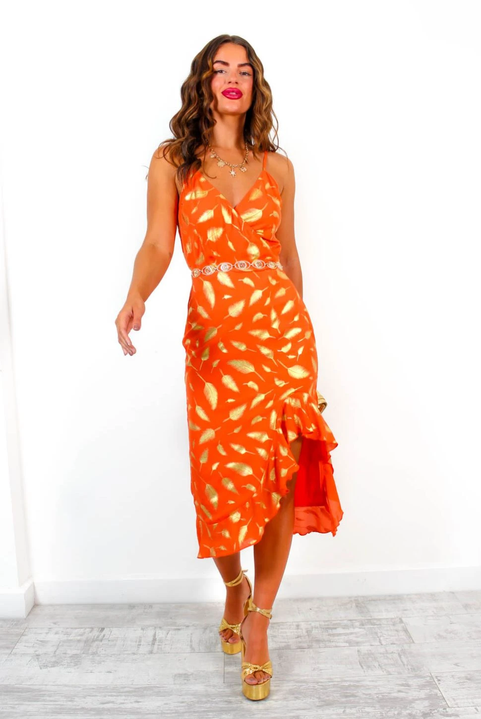 She looks like a dream, the prettiest Doll we have ever seen. With angelic gold fleck feather detailing throughout, this zesty orange midi dress features an asymmetric frilled hemline, adjustable spaghetti straps and crossover neckline. We’re wildly in love! Cinch with a gold chain belt and dress this stunner down for holiday evenings with glam golden sandals.