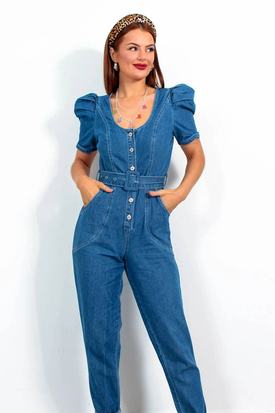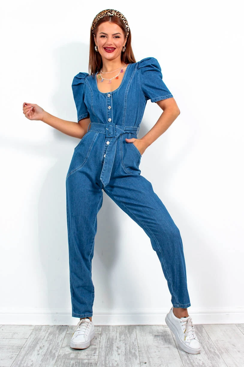 In the right denim, a girl can conquer all! This jumpsuit comes in a mid-blue denim material, short puffed sleeves, a swoop neck, buttons down the front and a removable waist belt to cinch. Pair with a cute raincoat and chunky trainers for a day at the park.