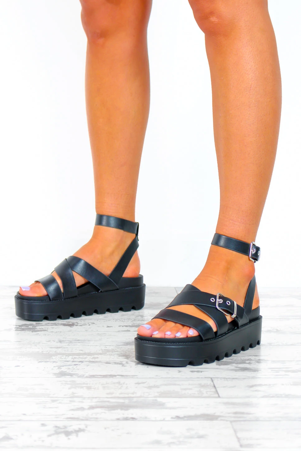 Me and these sandals are soulmates, we do everything together! With buckle ankle strap details and trending cleated platform soles, these strappy black faux leather sandals are our new go-tos for those Spring/Summer shenanigans. Keep it beachy in a bold bodysuit or slay seasonal street style with a fedora and floaty floral mini dress.